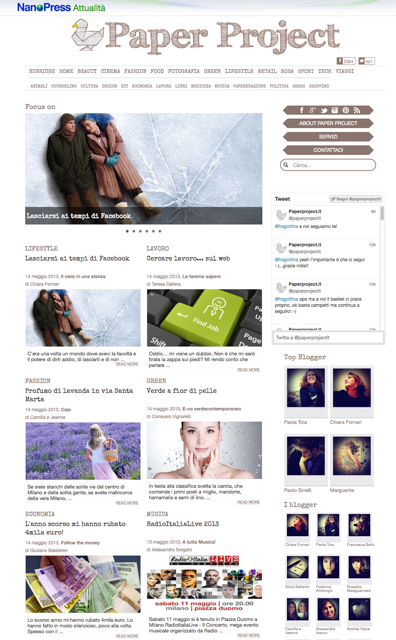 Informazione 100% made in Italy ma che sa anche dialogare con il mondo: Paper Project si apre da subito alla collaborazione con blogger “espatriati” con la volontà di raccontare la penisola ad un pubblico internazionale attraverso la narrazione di chi giorno dopo giorno “da fuori” fa opinione e tendenza sul Web tricolore.