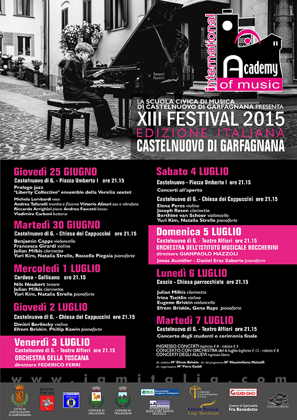 Prende il via giovedì 25 giugno con un prologo jazz, l’International Academy of Music Festival, la manifestazione che dal 2003 porta nella Valle del Serchio alcuni tra i migliori interpreti di musica da camera della scena internazionale. Giunto quest’anno alla 13esima edizione, l’evento beneficia del sostegno economico e istituzionale della Regione Toscana e rientra nel progetto regionale “La Toscana dei Festival”, richiamando ogni anno musicisti provenienti dai cinque continenti ad animare Castelnuovo, la Valle del Serchio e Lucca, grazie all’organizzazione della Scuola Civica di Musica di Castelnuovo di Garfagnana. Partecipano artisti dei più celebrati conservatori del mondo ai quali si affiancano, determinando l’assoluta unicità della manifestazione, alcuni tra i migliori giovani talenti della scena musicale internazionale.