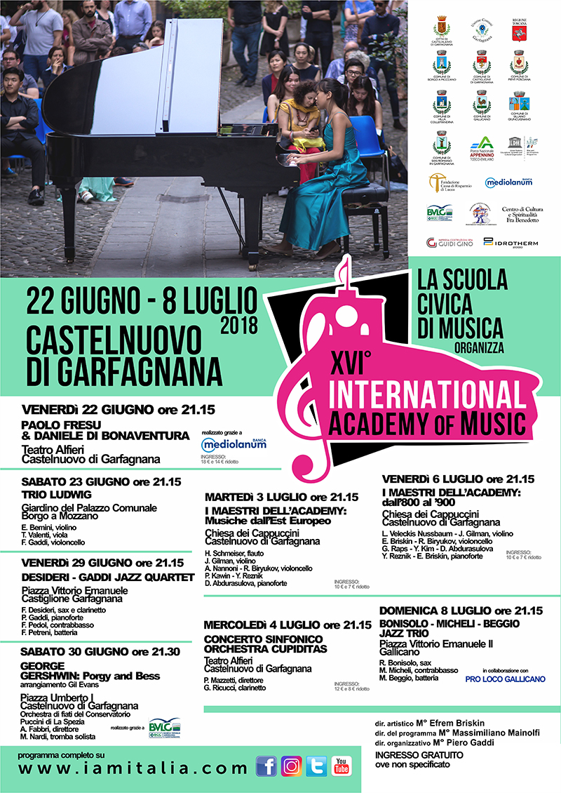 I più grandi nomi della musica classica insieme alle giovani stelle internazionali si danno appuntamento a Castelnuovo Garfagnana dal 22 giugno all’8 luglio 2018 per l’International Academy of Music Festival.