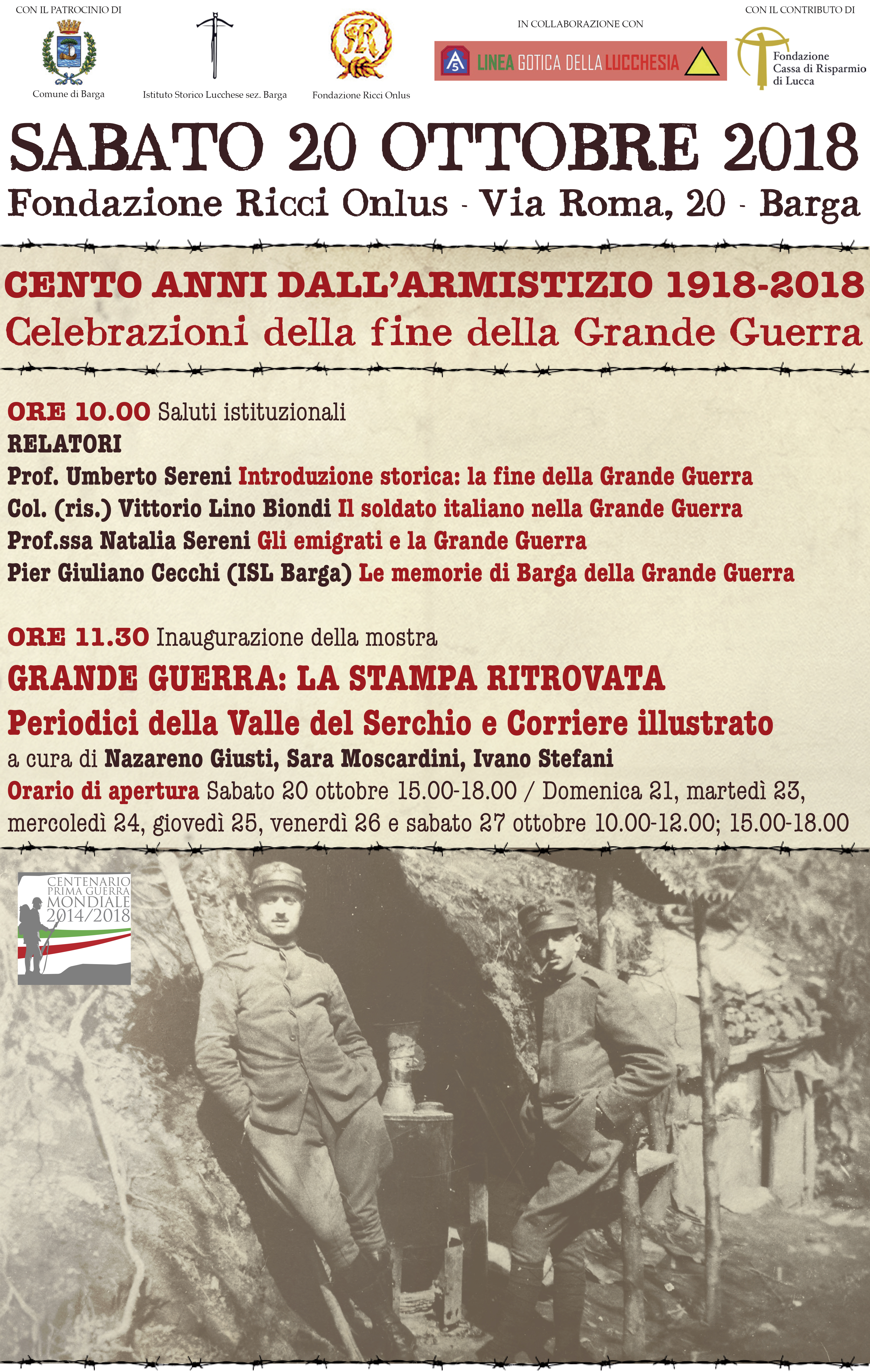Alle 11,30 si inaugura la mostra “Grande Guerra: la stampa ritrovata. Periodici della Valle del Serchio e Corriere illustrato”, a cura di Nazareno Giusti, Sara Moscardini e Ivano Stefani, aperta dal 20 al 27 ottobre 2018.