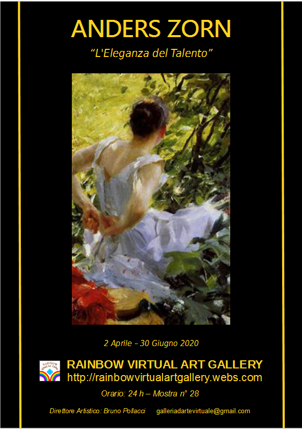 Presso la “Rainbow Virtual Art Gallery”, Galleria d’Arte virtuale no profit, a scopo culturale diretta da Bruno Pollacci, direttore dell’Accademia d’Arte di Pisa, si apre la mostra di pittura e grafica di Anders Zorn, intitolata “L’Eleganza del Talento” . La mostra sarà visitabile fino al 30 Giugno, gratuitamente, 24 ore su 24 e con un semplice click da smartphone, tablet o PC . Una volta entrati nel sito della Galleria, per visionare le opere cliccare su “PHOTO GALLERY”, in alto, nel menu (nei cellulari il menu è rappresentato da tre righe, in alto a destra). Nell’area “Video Mostre” sono visionabili tutti i video delle mostre precedenti e nell’area “Locandine Mostre” sono visionabili e scaricabili le tutte le locandine delle mostre.