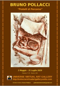 Si apre la mostra “BRUNO POLLACCI: “Fratelli di Percorso”, allestita presso la “Universe Virtual Art Gallery”, Galleria d’Arte virtuale no profit, a scopo culturale diretta da Bruno Pollacci, direttore dell’Accademia d’Arte di Pisa. La mostra sarà visitabile fino al 31 Luglio 2020, gratuitamente, 24 ore su 24 e con un semplice click da smartphone, tablet o PC all’indirizzo. Una volta entrati nel sito della Galleria, per visionare le opere cliccare su “PHOTO GALLERY”, in alto, nel menu (nei cellulari il menu è rappresentato da tre righe, in alto a destra). Nell’area “Link Video Mostre” sono utilizzabili i link per visionare tutti i video delle mostre precedenti pubblicati su You Tube e nell’area “Locandine Mostre” sono visionabili e scaricabili le tutte le locandine delle mostre precedenti.