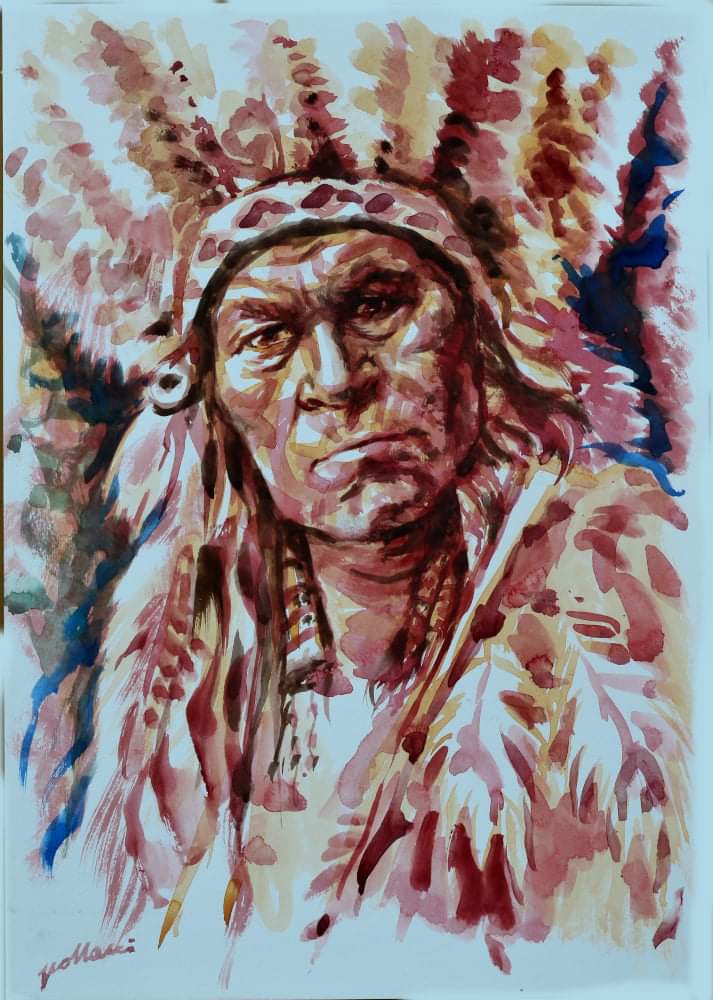 “Essendo sempre stato dalla parte dei Nativi – chi ha visto le mostre dei suoi lavori a Pisa e Lucca per esempio, lo ha sentito col cuore – ed avendo una collezione di oltre 200 immagini fotografiche d’epoca di quel periodo, ne presi spunto e testimonianza per realizzare molte opere sul tema e questo ritratto di giovane capo guerriero, è uno tra quelli nei quali ho cercato di cogliere quel sentimento di fiera identità, orgoglio e determinazione. Questa mia opera ad acquerello, che ha fatto parte di molte mie mostre personale sul tema, è dedicata al Popolo dei Nativi con la mia forte solidarietà e vicinanza ideale.”