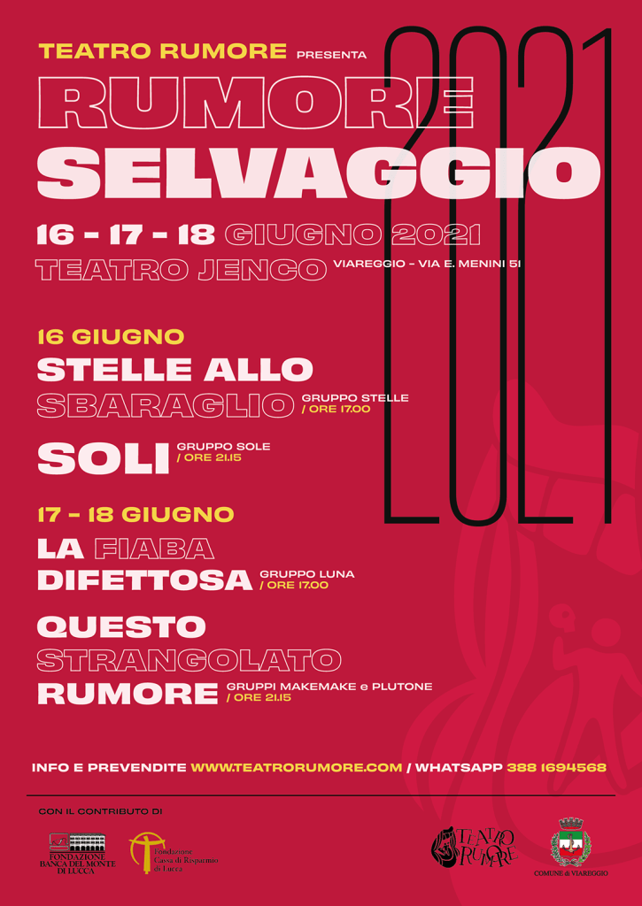Identici gli spettacoli di giovedì 17 e venerdì 18 giugno. Alle 17:00 va in scena “La Fiaba Difettosa”, una commedia divertente che ha per protagoniste tre streghe che vogliono sterminare i bambini di un villaggio surreale, popolato di visionari, sceriffi, allegre zitelle e preti esorcisti. Alle 21:15 un grande classico di Teatro Rumore, “Questo Strangolato Rumore”, lo spettacolo scritto da Davide Moretti e liberamente ispirato all’ospedale psichiatrico più antico d’Italia, quello di Maggiano, alle porte di Lucca, il manicomio dove operò anche lo psichiatra e scrittore viareggino Mario Tobino. Un’opera coinvolgente e suggestiva, che nel 2015 costituì la quota italiana nel cartellone del Brighton Fringe Festival in Inghilterra.