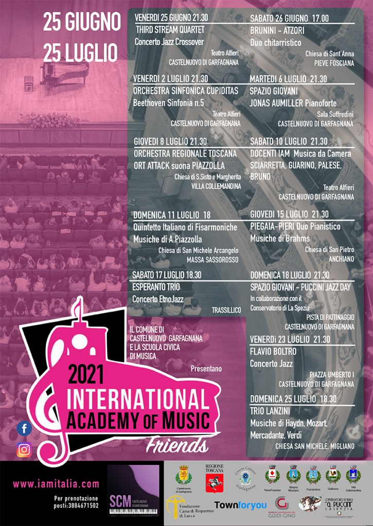 L’evento è organizzato dalla Scuola Civica di Musica di Castelnuovo di Garfagnana e rientra nel progetto regionale “La Toscana dei Festival”. L’International Academy of Music Festival è uno dei tre festival europei affiliati al celebre Summit Music Festival di New York, evento di riferimento internazionale nel quale musicisti classici e didatti tra i più prestigiosi d’America, d’Europa e non solo.