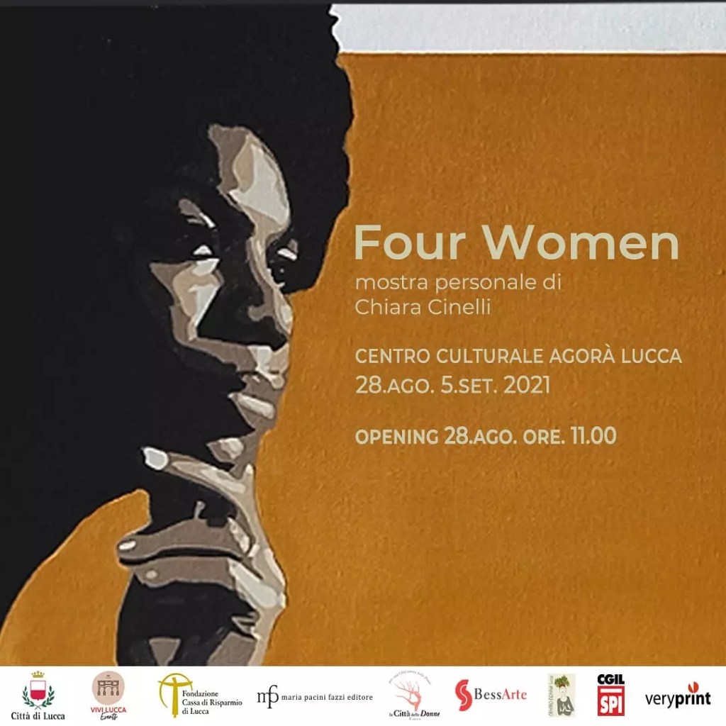 Inaugurata oggi l’esposizione personale di Chiara Cinelli “Four women” che comprende una serie di dipinti a tecnica mista su tela: sono i ritratti di Nina Simone, Alice Walker, Toni Morrison, Maya Angelou: quattro donne che hanno lasciato un segno indelebile nella cultura afroamericana e mondiale.