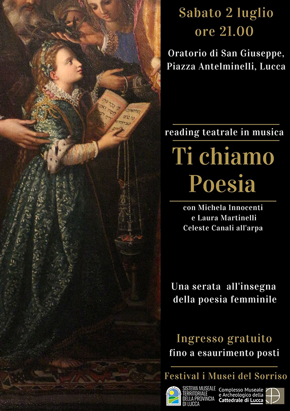 “Ti chiamo poesia”: al via sabato 2 luglio 2022 alle 21 a ingresso libero il festival “I Musei del Sorriso”, con un reading teatrale in musica all’Oratorio San Giuseppe (piazza Antelminelli, Lucca), organizzato dal Complesso museale e archeologico della Cattedrale di Lucca.