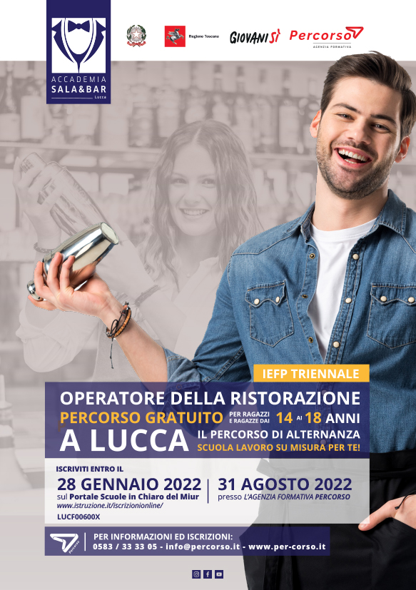 Il corso di “Operatore della Ristorazione con indirizzo Servizi di Sala Bar” si svolgerà nelle aule dell’agenzia formativa a Lucca, avrà una durata di 1056 ore annue per un totale di 3168 ore e al secondo e al terzo anno prevede 400 ore di stage nelle imprese del territorio. Al secondo e al terzo anno sono previste 400 ore di stage nelle imprese del territorio (800 ore in totale); offre inoltre 45 ore ad allievo da destinare alle attività d’orientamento e accompagnamento nel mondo del lavoro, 1184 ore di lezioni teoriche per la formazione di base e tecnico-professionale, 800 di alternanza scuola-lavoro, svolte in sede.