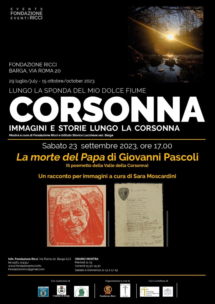 La mostra “Lungo la sponda del mio dolce fiume CORSONNA. Immagini e storie lungo la Corsonna” è realizzata dalla Fondazione Ricci e dall’Istituto Storico Lucchese sezione di Barga grazie al sostegno della Fondazione Cassa di Risparmio di Lucca e di Pinelli Assicurazione, con il patrocinio del Comune di Barga, della Provincia di Lucca e della Fondazione Giovanni Pascoli; è visitabile fino a domenica 15 ottobre 2023 a ingresso libero con i seguenti orari: martedì 11-13, venerdì 15,30- 19,30, sabato e domenica 11-13 e 17-19.